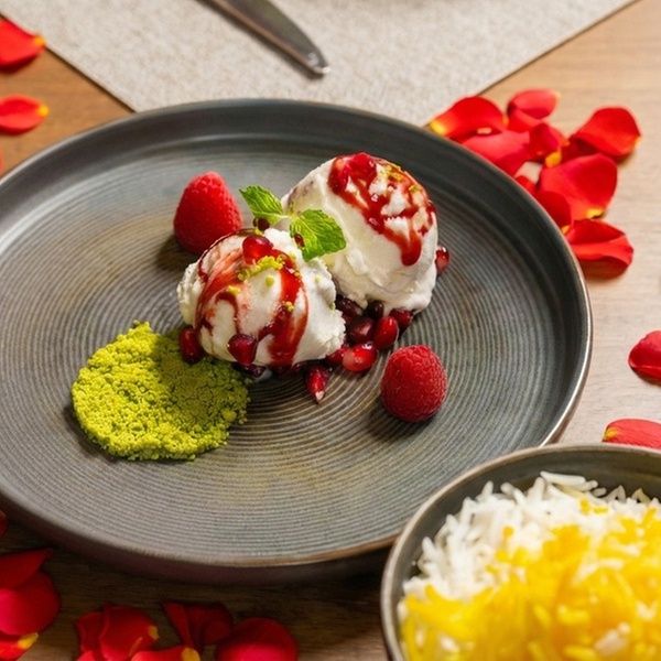 • Handcrafted Persian dessert with pistachio ice cream and pomegranate accents