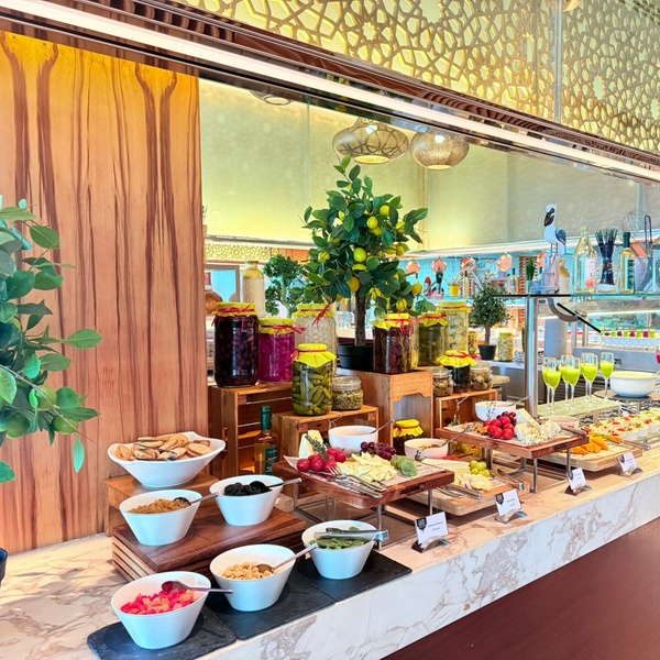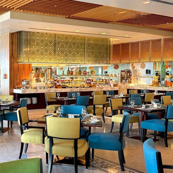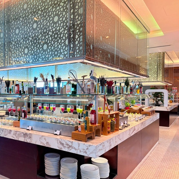 Lavish buffets for breakfast, lunch, and dinner are enjoyed by guests as aromas reminiscent of all corners of the world are wafted from the open kitchen. Locally farmed produce and delicious Arabic specialties are highlighted, with eggs made to order and freshly baked croissants nestled together. Oven-cooked Italian pizzas sizzle upon presentation, and Moroccan tajines stew harmoniously. Artisan Kitchen, a stylish all-day dining restaurant with natural daylight and hues of aubergine, mustard, chocolate, and burgundy, is where these culinary delights are served.
