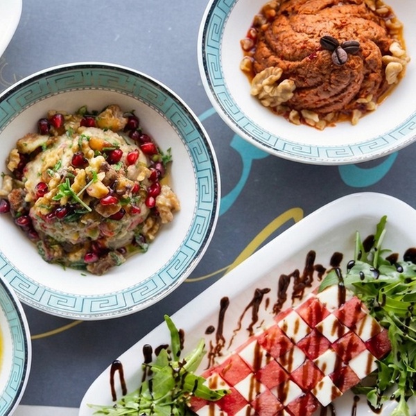 Appetizer A selection of Arabic mezze including favorites like hummus, moutabbal, fattoush, and vine leaves.