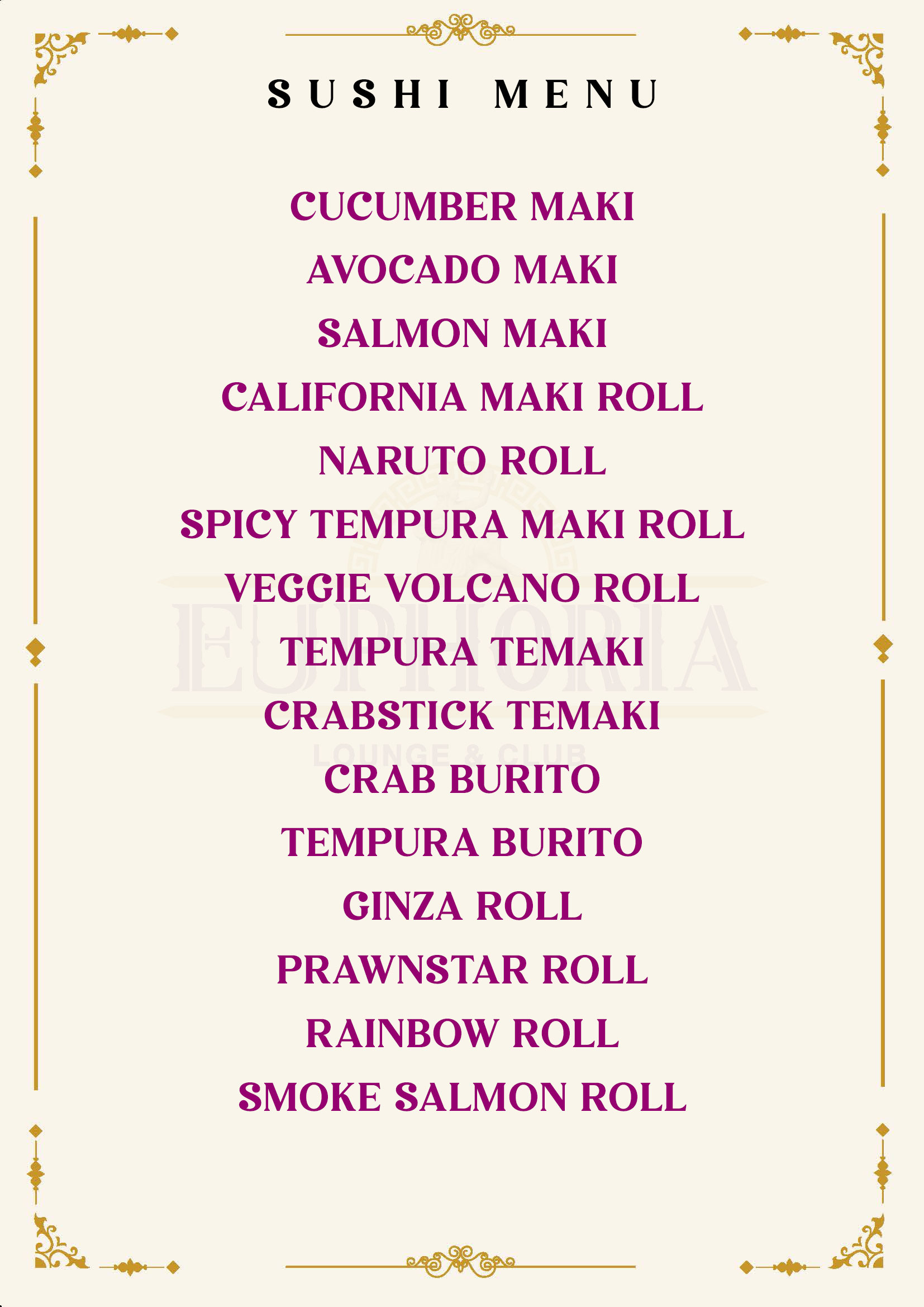 Experience free-flowing sushi every Sunday with nonstop vibes at Euphoria's late-night feast, perfect for a classy night out
