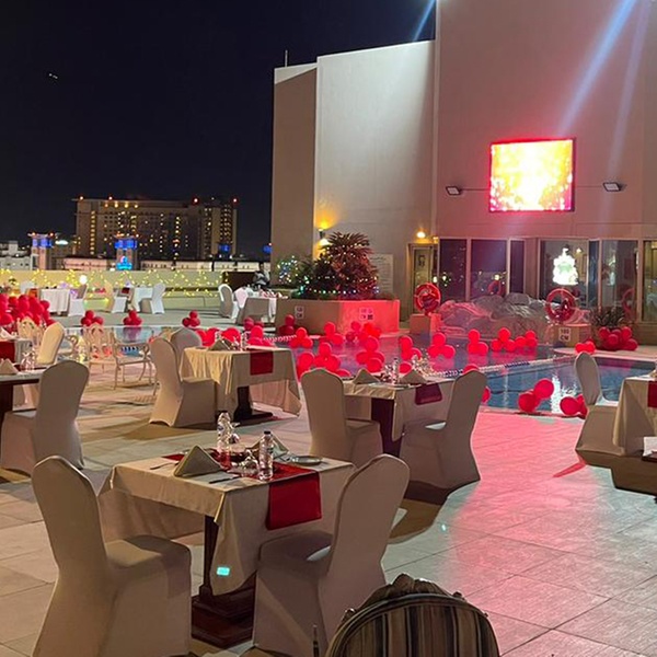 Expect a truly romantic ambiance with soft lighting, serene poolside views, and an elegant rooftop setting offering city panoramas. Your table will be intimately set with candlelight and floral decorations, complemented by live music and entertainment.