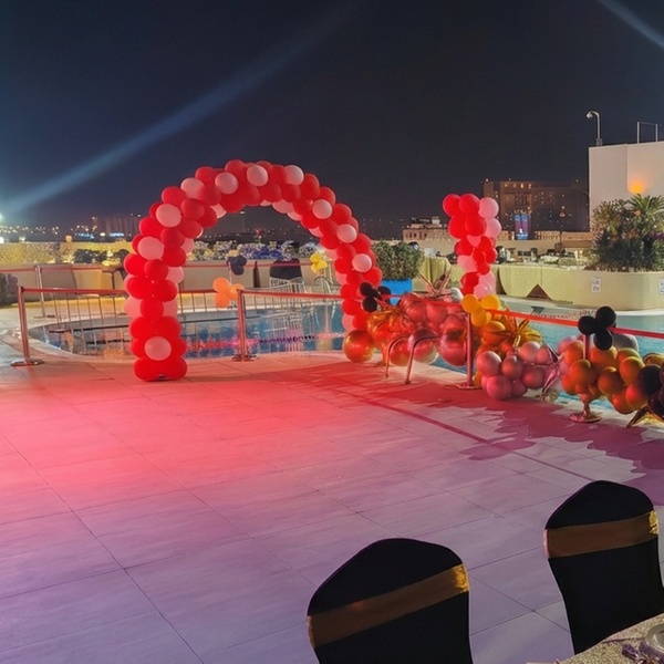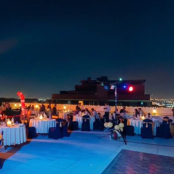 Expect a truly romantic ambiance with soft lighting, serene poolside views, and an elegant rooftop setting offering city panoramas. Your table will be intimately set with candlelight and floral decorations, complemented by live music and entertainment.