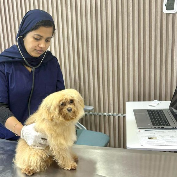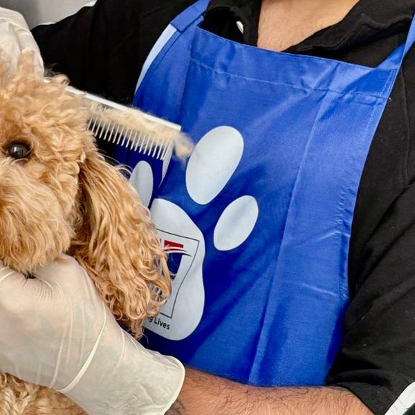 - Full Grooming – Medium Dog: Bath, blow dry, breed-specific haircut, brushing, nail trim, ear cleaning