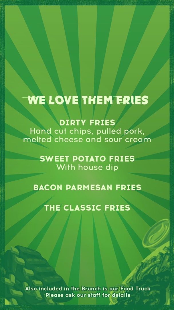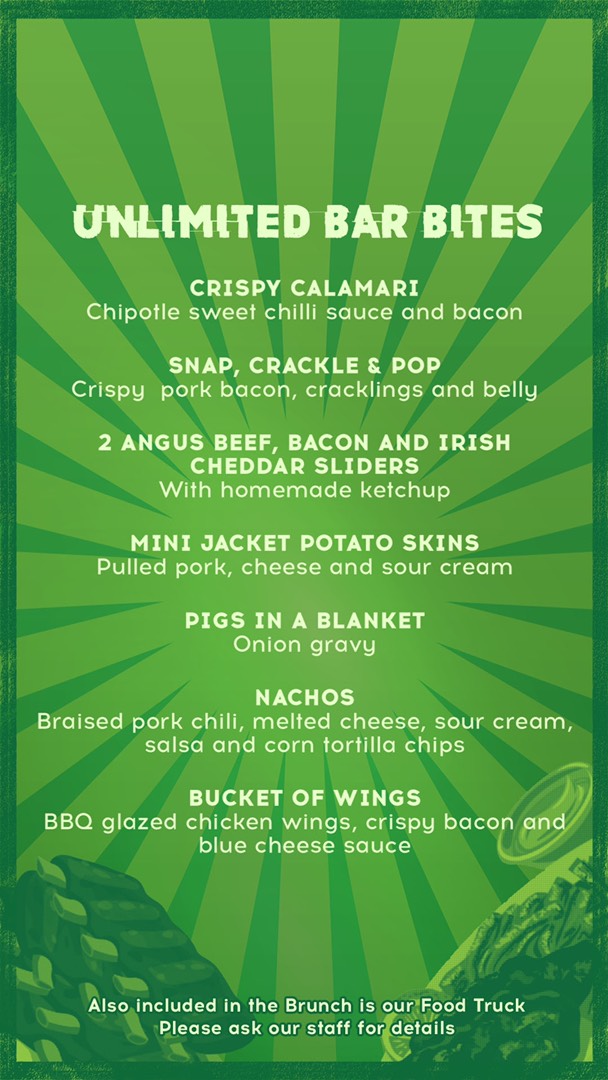 Click here for Menu: Main course, Unlimited bar bites, and Fries.