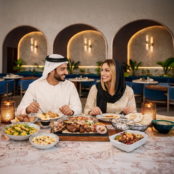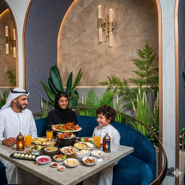 • Enjoy a refined Iftar buffet featuring fresh salads and Arabic mezze