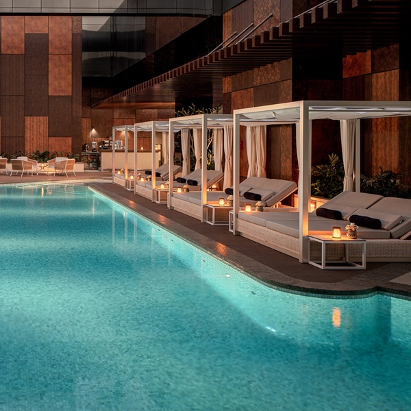 Relax at SunGlo 19 @ 5* DoubleTree by Hilton Dubai M Square Hotel with exclusive pool access and savor delicious food & beverage credits for an unforgettable luxury experience