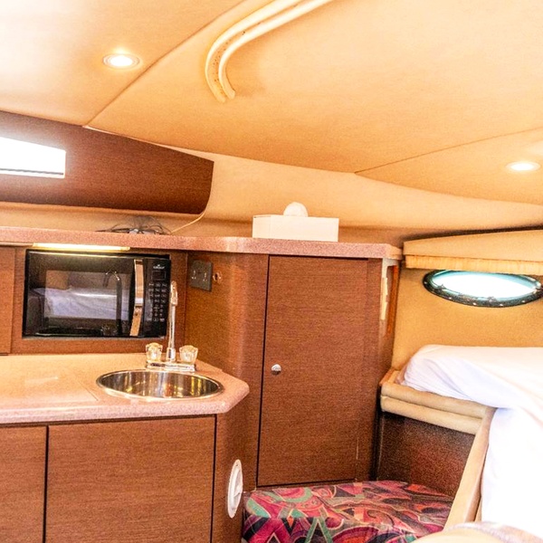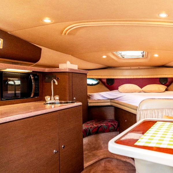 The yacht can comfortably accommodate 1 to 8 guests. It is a 33ft Regal model, comes with fuel included, and features one bedroom and one bathroom, ensuring comfort for all passengers.