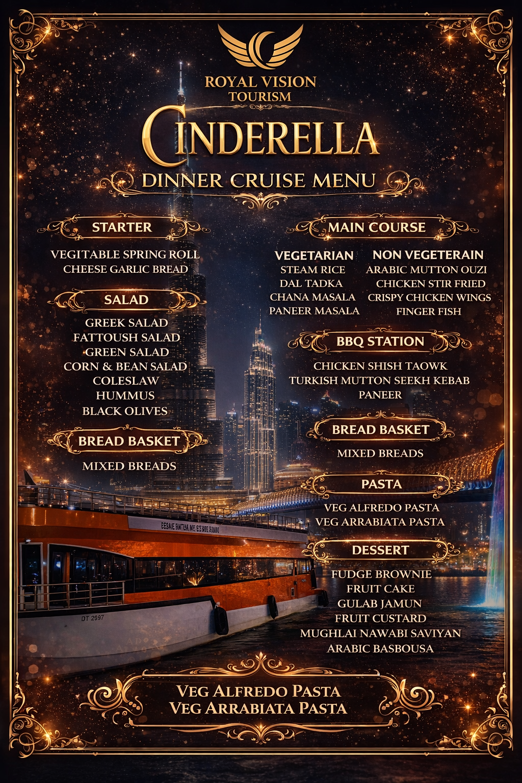 Celebrate the holy month of Ramadan with a serene Iftar or Suhoor experience aboard a traditional boat in Dubai, where the calm waters and gentle cruise set the tone for a truly meaningful evening. As you sail along Dubai’s iconic waterfront, Enjoy a gourmet international buffet, live cooking stations, and free flowing soft drinks as you glide past iconic landmarks and illuminated bridges. This Ramadan boat cruise offers a unique way to break your fast, bringing together authentic Arabic hospitality, delicious traditional dishes, and a relaxing journey across Dubai that allows you to fully embrace the spirit of the season.