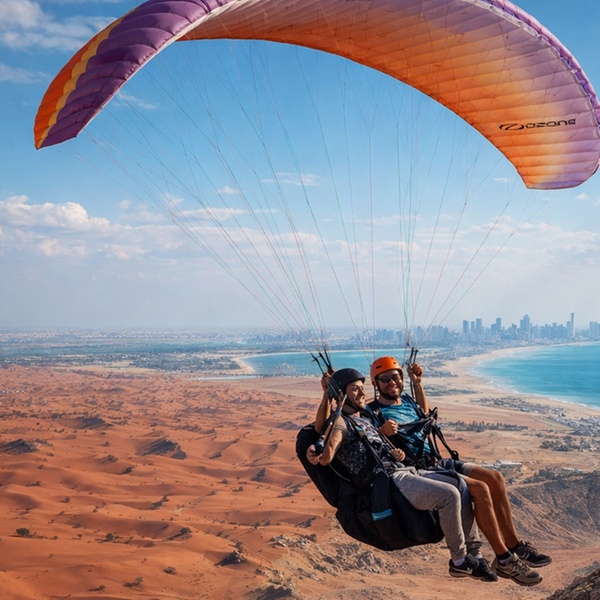 Experience the thrill of paragliding in Sharjah with a professional pilot guiding your every move. Let go of all fears and focus entirely on the incredible freedom of soaring above the earth