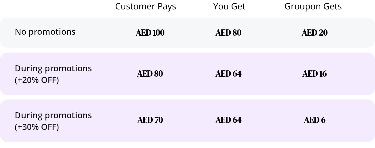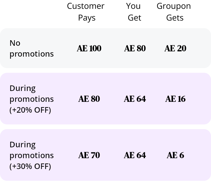 Groupon co-invests with you. We cut our profits and cover a portion of the cost of your promotion.
